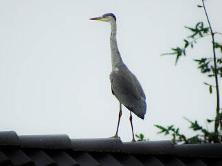 De reiger op het dak van de overburen, loerend naar onze visvijver, waar hij eerder 14 grote vissen uit heeft gevist. mei 2015